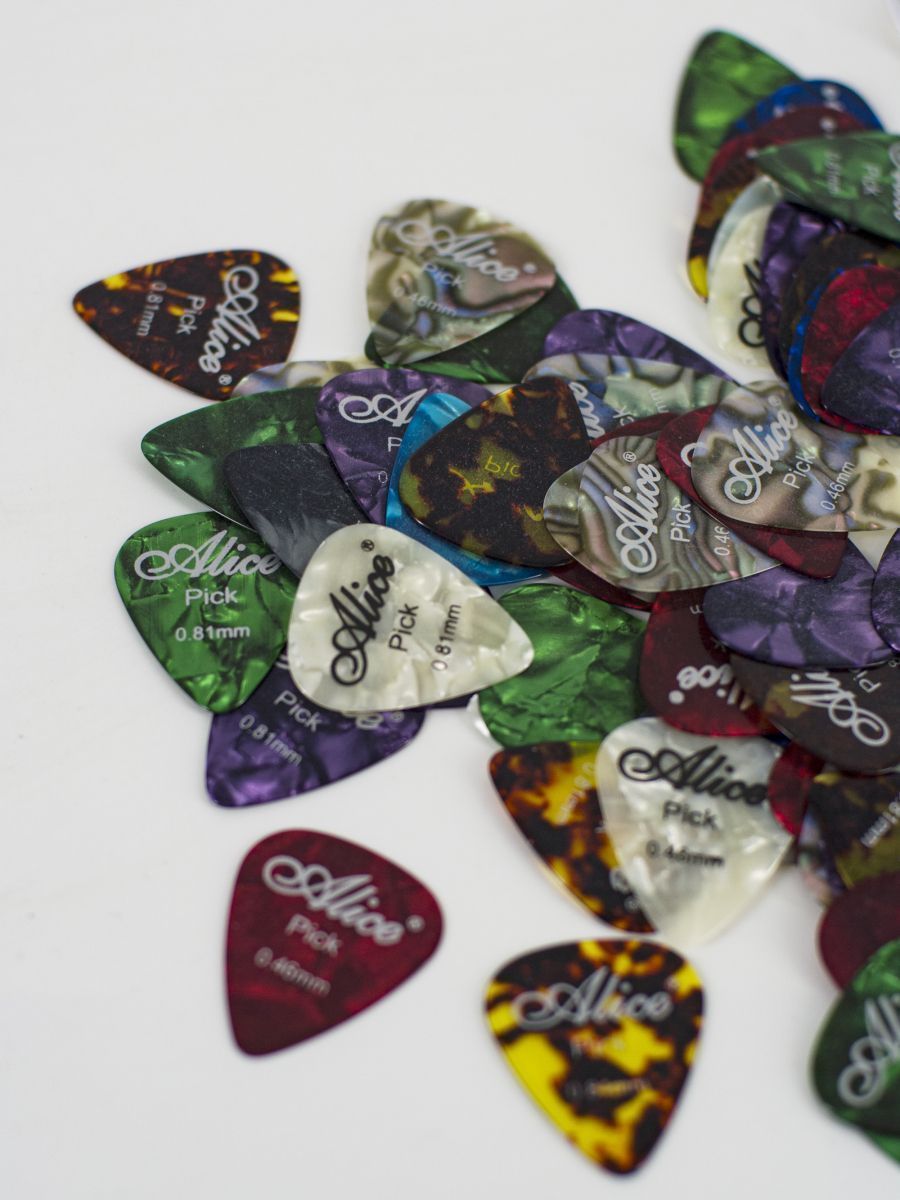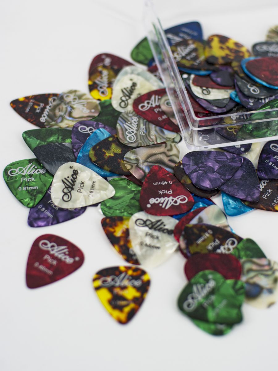 Alice AP-100A Медиаторы, целлулоид, разноцветные, толщина 0,46-0,81, набор из 100шт