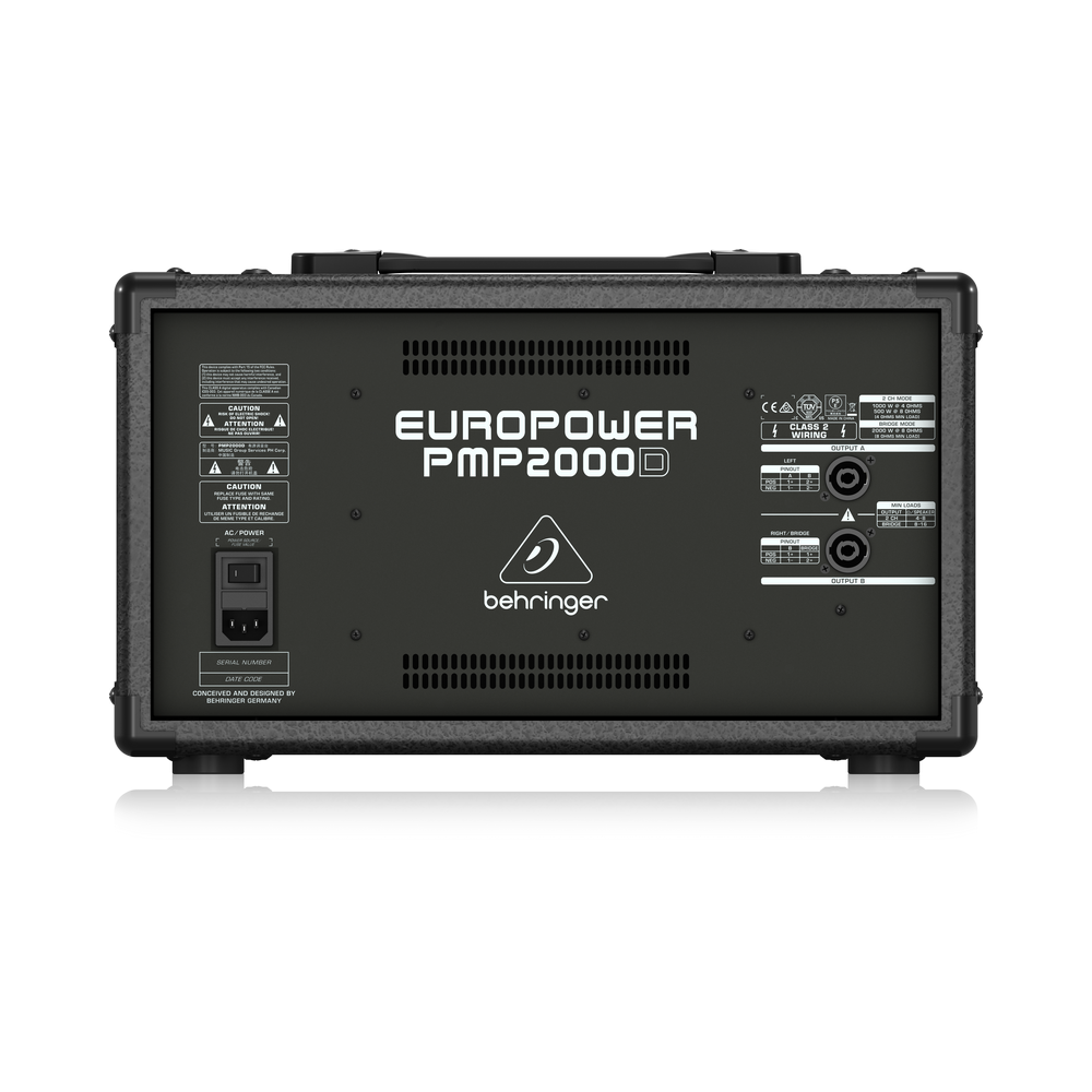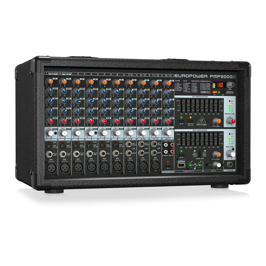 Активный 14-канальный микшер Behringer PMP2000D позиционируется разработчиком как идеальное и простое в использовании решение для живых выступлений. Особенности Behringer PMP2000D: Встроенный усилитель класса D с выходной мощностью 2 х 500 Вт на 8-омной нагрузке и 2 х 1000 Вт на 4-омной; Три режима работы усилителя: стерео, двойное моно (main/monitor) и мостовой; Секция микшера с четырнадцатью входными каналами (6 моно плюс 4 стерео); Дополнительный стереофонический AUX-вход для подключения смартфона, MP3-плеера и других устройств; Трёхполосный EQ, кнопки "Pad" и индикаторы клиппинга на всех моноканалах;