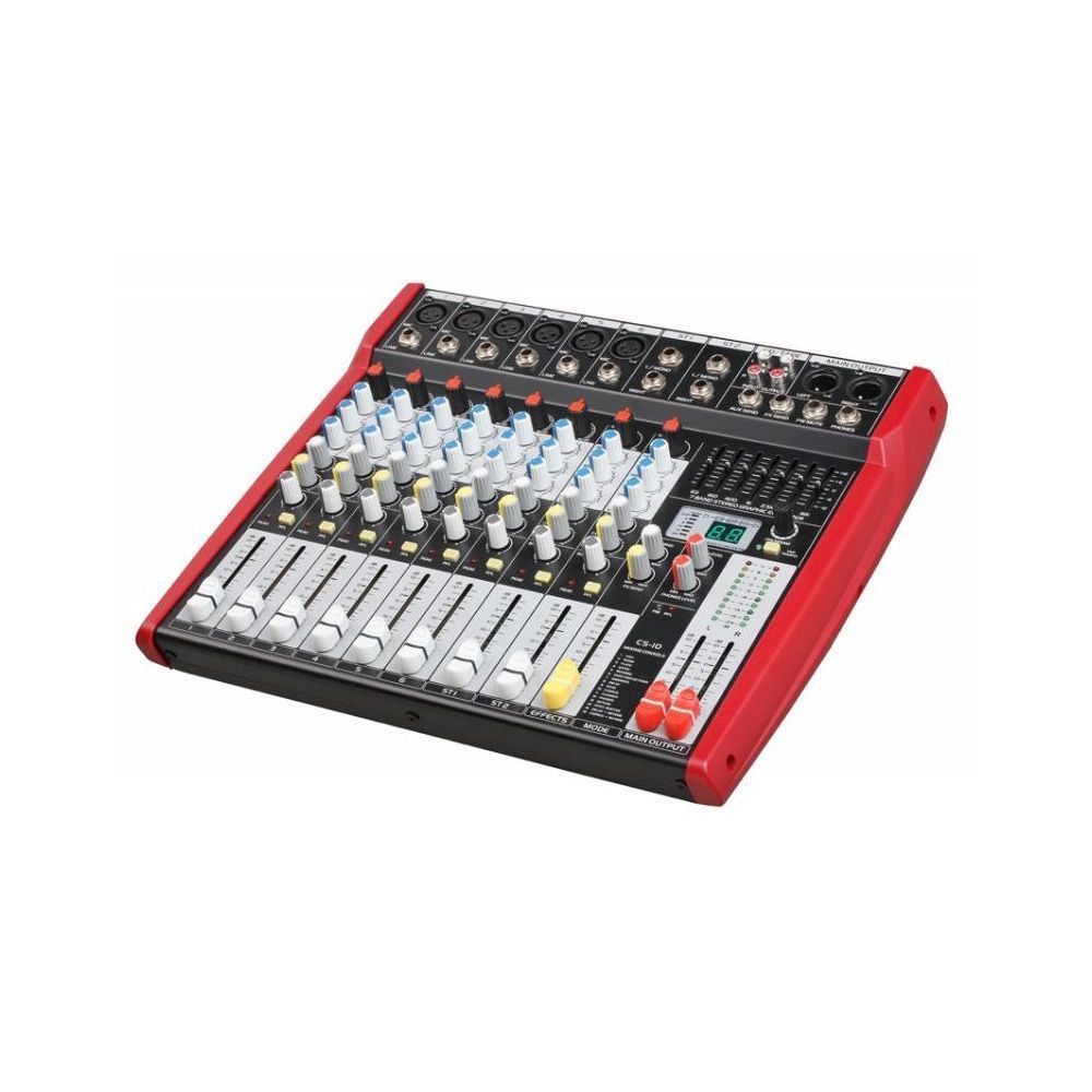 BG CS-10 – это качественный микшерный пульт с мощным усилителем звука. Модель создана в соответствии со стандартами первоклассных консолей, что обеспечивает долгий срок службы и прекрасные акустические характеристики.   Микшер облададает компактным дизайном, поэтому очень удобен при перевозке. Панель управления может наклоняться на 10 градусов в целях обеспечения наилучшего обзора. Резиновая основа BG CS-10 позволяет работать на ровной поверхности. Консоль оборудована 3-полосным эквалайзером, который имеет различные регуляторы: HIGH и LOW – обрезные фильтры, отражающие высокие и низкие частоты; MID – регулятор средних частот; фильтр «колокольного» типа, который позволяет воздействовать на большинство основных частот всех музыкальных инструментов и человеческого голоса. DSP-процессор производит стандартные эффекты первоклассного уровня, не требуя при этом отдельного подключения. Простой интерфейс будет понятен даже тем, кто никогда не работал с микшерами.