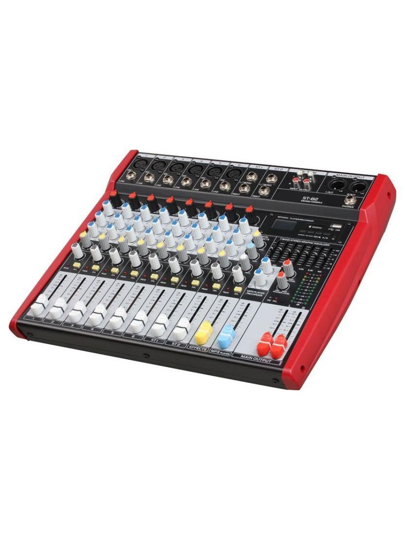 BG ST-82 – это бюджетный аналоговый микшерный пульт. Консоль обеспечивает прекрасное решение для легкости и удобства подключений. Микшер создан в соответствии со стандартами первоклассных консолей, благодаря чему вы можете с уверенностью рассчитывать на надежность в эксплуатации и прекрасные акустические характеристики. BG ST-82 обладает компактным дизайном и имеет две прочные боковые ручки. Панель управления может наклоняться на 10 градусов в целях обеспечения наилучшего обзора, что является большим преимуществом. Консоль обладает 3-полосным эквалайзером и процессором DSP-эффектов. Микшер оснащен слотом для карты SD и портом USB. Главной особенностью модели является наличие встроенного MP3-плеера, который может записывать аудиосигнал, исходящий с канала main, и сохранять его в текущий блок памяти в формате WAV. BG ST-82 может быть использован для проведения концертов, публичных мероприятий, торжеств и презентаций.