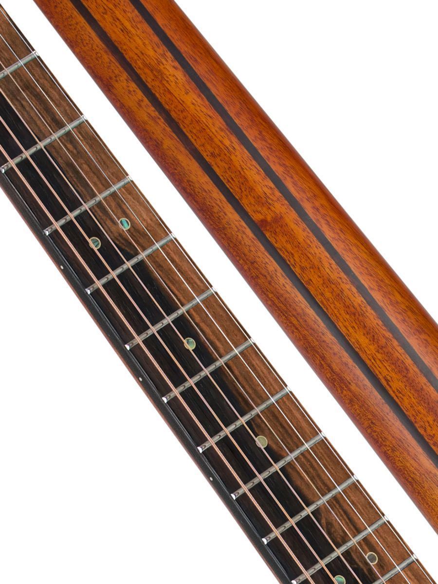 Электроакустическая гитара Bromo BAT8MEBK - это профессиональный инструмент с уникальным внешним видом и впечатляющими акустическими характеристиками. Формат Mini Jumbo - оптимальный баланс между компактностью и глубиной звучания. Удобный корпус не утомляет при долгой игре, но даёт богатый резонанс и хорошую проекцию звука. Верхняя дека из цельного махагони обеспечивает тёплый, сбалансированный тон с выраженными средними частотами и отличной артикуляцией. Запатентованная система крепления Tone-Flow Bracing System усиливает передачу вибраций по всему корпусу, обогащает тембр и делает отклик более отзывчивым. Нижняя дека и обечайка из ореха добавляет звуку глубины и яркости, подчёркивает верхние частоты, создаёт объёмную реверберацию. Гриф махагони с двумя вставками из эбена обеспечивает прочность, стабильность и долгий сустейн. Накладка грифа - двухцветный макассарский эбен, отличается плотностью и твёрдостью, что улучшает чёткость звучания и долговечность ладов. Двухсторонний анкер позволяет точно регулировать прогиб грифа под разные стили игры и условия окружающей среды. Матовая отделка с чёрной верхней декой придает инструменту стильный внешний вид и тактильно приятное покрытие, которое не скользит и не собирает отпечатки пальцев. Bromo BAT8MEBK – это не просто электроакустическая гитара, это ваш билет в мир выразительного звучания и компактного комфорта.