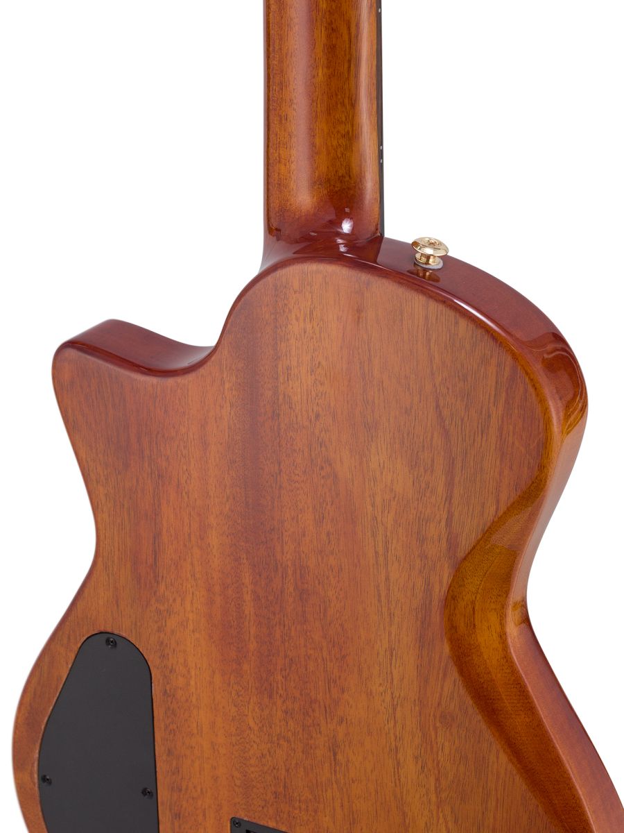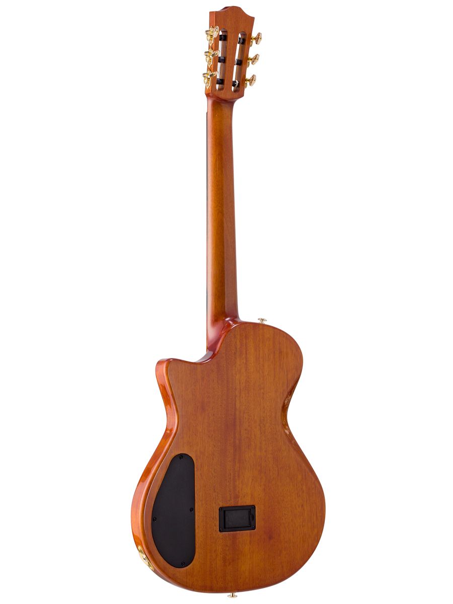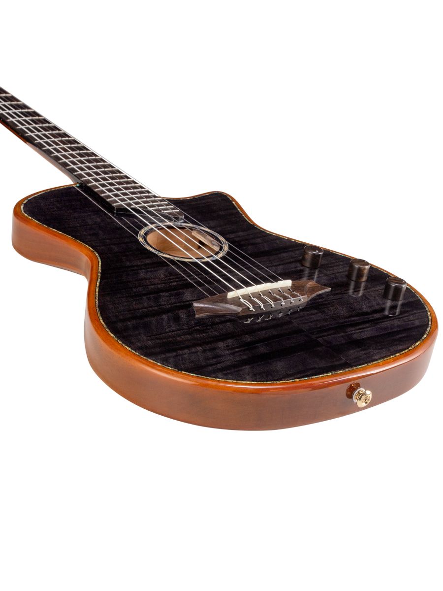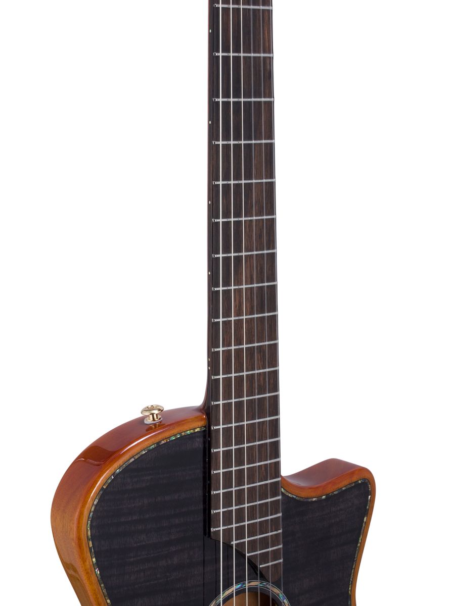 Серия: Fusion Craft Форма корпуса: Hollow Body with Cutaway Мензура: 650 мм (25 19/32”) Ширина грифа на нулевом ладу: 48 мм (1 57/64”) Ширина порожка: 45 мм (1 49/64") Корпус: махагони Верхняя дека: ель с шпоном из огненного окуме класса 5A Гриф / накладка грифа: махагони / макассарский эбен Анкерный стержень: двухсторонний Лого на голове: гора Бромо, перламутр Оформление резонаторного отверстия: «Ковбойская веревка» Бридж: "Орлиное крыло", черное дерево Amara Лады: 22 Верхний и нижний порожки: кость Колки: винтажные "Mt. Bromo", позолоченные Электроника: пьезодатчик + 3-позиционный звукосниматель под струнодержателем Отделка: глянцевый лак Цвет: Trans Black В комплекте: утепленный жесткий кейс