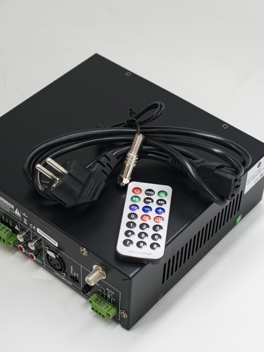 Мощность: 60 Вт Разъемы: 1 Mic, 1 Line Линейный выход: 70В/100В/4-8Ом USB/SD Mp3 плеер, FM тюнер, Bluetooth, Echo