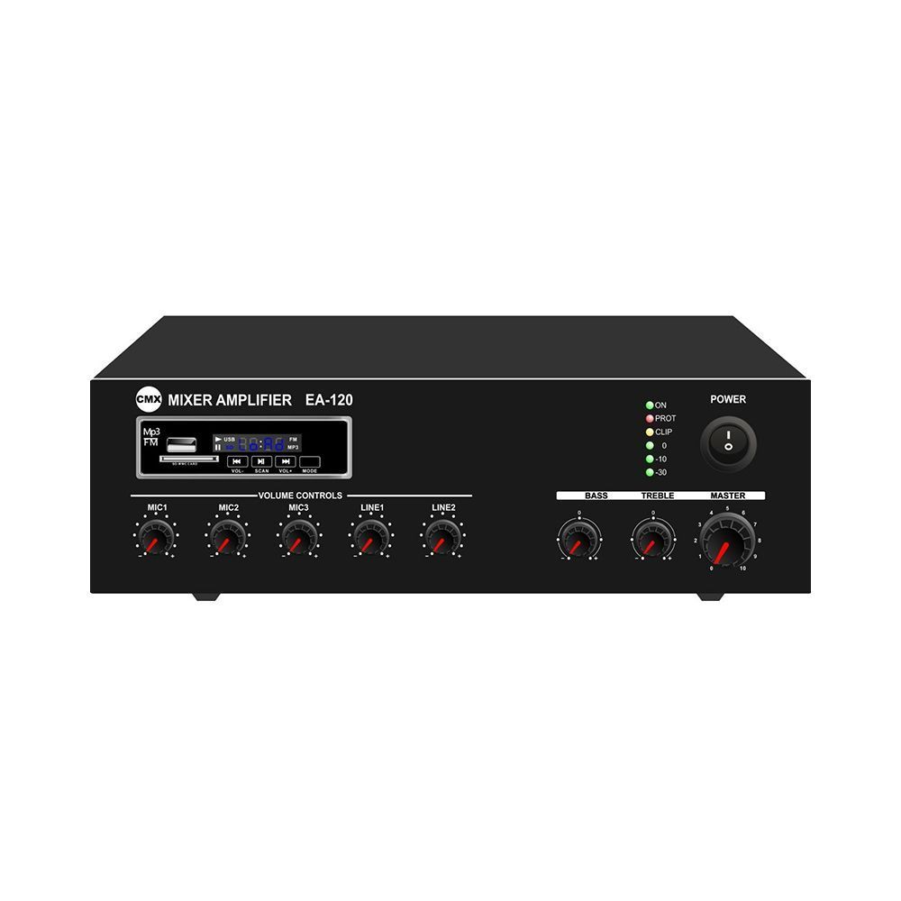 CMX Audio EA-120 представляет собой компактный микшер-усилитель мощностью 120 Вт. Модель оборудована защитой от короткого замыкания, перегрузки и высокой температуры. Особенности модели: – Mp3-плеер с USB/SD-входом на передней панели, ИК-пульт дистанционного управления для Mp3-плеера, FM-радио и Bluetooth – светодиодные индикаторы питания, защиты и сигнала – регулятор громкости для Mic1-3, line1-2, Mp3/FM, низких/высоких частот – с защитой от короткого замыкания, зажима, перегрузки и высокой температуры CMX Audio EA-120 – это отличное соотношение цены и качества.