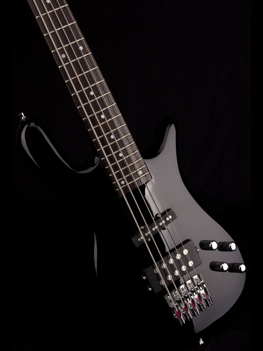 Корпус бас-гитары выполнен из махагони, что обеспечивает ей прочность и долговечность. Гриф также сделан из махагони. Накладка из палисандра придает инструменту уникальный звук. Бас-гитара оснащена контроллерами Treble/ Middle Frequency, Bass, которые позволяют настроить звучание инструмента под любой стиль музыки. Также есть регуляторы громкости и баланса. Гитара выполнена в черном цвете.